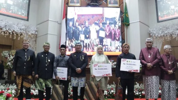 Ketua DPRD Kabupaten Bogor Rudy Susmanto mendampingi Plt Bupati Bogor Iwan Setiawan dan Gubernur Jawa Barat Ridwan Kamil menyerahkan penghargaan kepada perwakilan dua tokoh pencipta Mars Tegar Beriman, yakni kepada Fajar Endra Sukmana putra pertama dari almarhum H Tedja Sukmana, dan kepada Wulan Fitria putri dari H Ase Rukmantara.